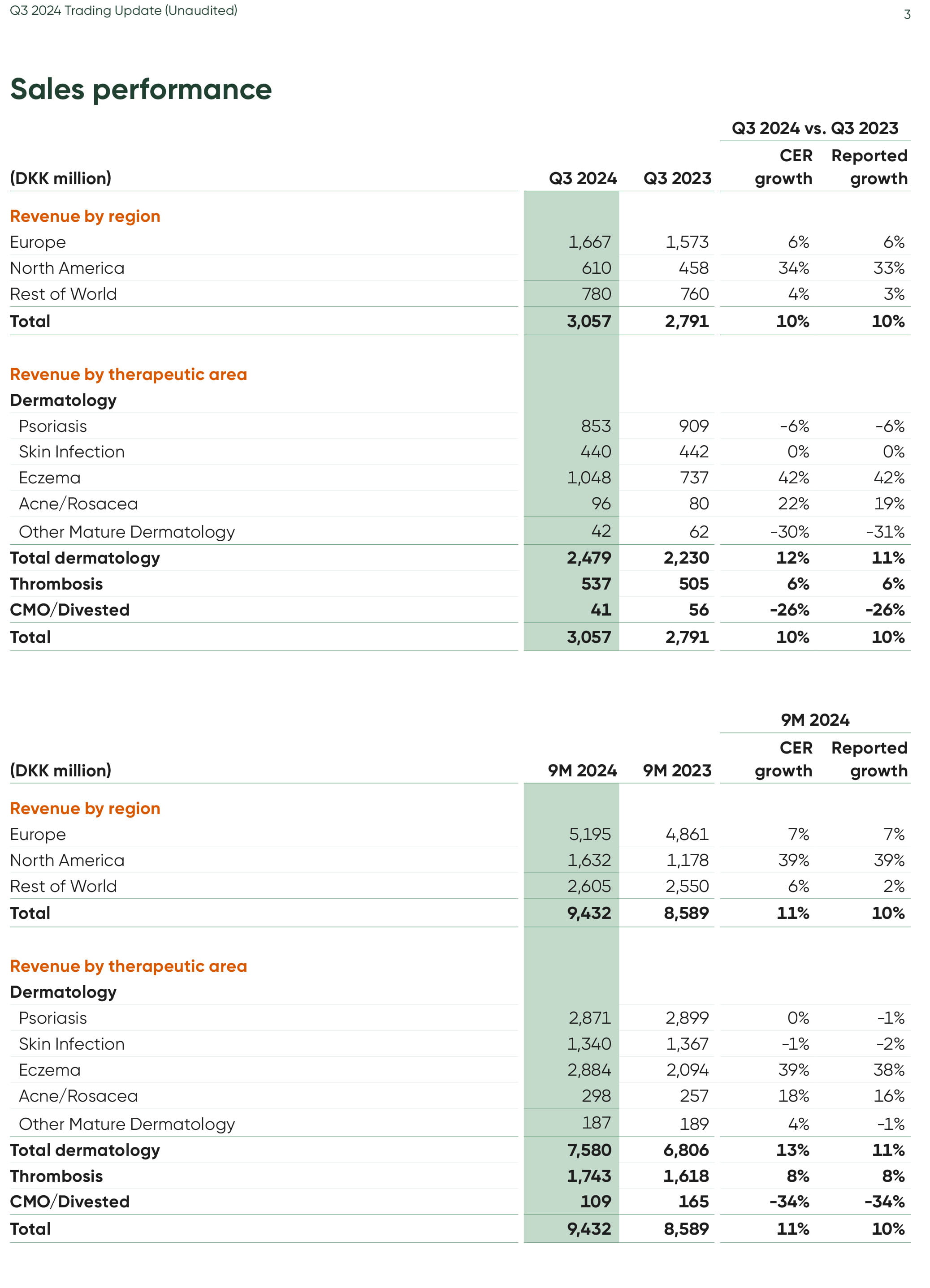 - Revenue grew 10% (CER) to DKK 3,057 million (Q3 2023: DKK 2,791 million). Reported growth was 10%.
