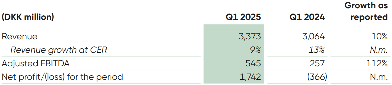 - Operating profit improved significantly, with adjusted EBITDA reaching DKK 545 million in Q1 2025, reflecting a margin of 16% (Q1 2024: 8%) excluding the upfront payment from Gilead and other non-recurring items.
